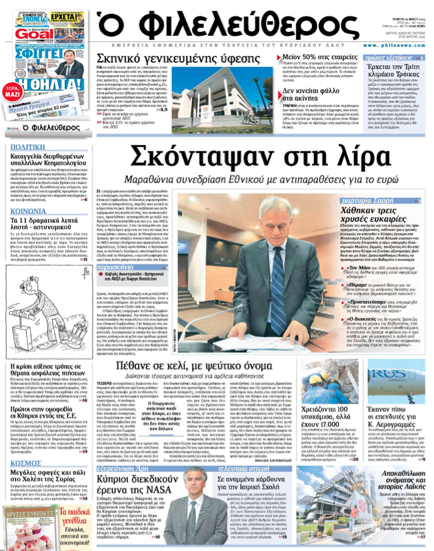 «Ο Φιλελεύθερος», με τίτλο «Σκόνταψαν στη λίρα», γράφει ότι σε ενημέρωση και κατάθεση απόψεων κινήθηκε η πολύωρη σχεδόν εξάωρη συνεδρίαση του Εθνικού Συμβουλίου, και ότι η σύνοδος χαρακτηρίστηκε από αντιπαραθέσεις παρόλο που γενικά το κλίμα ήταν θετικό. Αλλού, γράφει ότι τις βαλίτσες για την Κύπρο ετοιμάζει η τεχνοκρατική ομάδα της Τρόικας για αξιολόγηση εφαρμογής των μέτρων του μνημονίου που θα αρχίσει τον Ιούλιο. Επίσης, η εφημερίδα αναφέρει ότι για τα καλά έχουν φανεί οι επιπτώσεις στην κυπριακή οικονομία από τις αποφάσεις του Γιουρογκρουπ και τα μέτρα για τις τράπεζες.