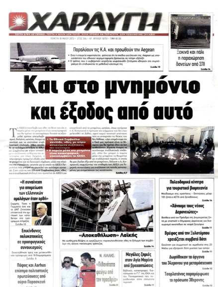 Η «Χαραυγή», υπό τον τίτλο «Και στο μνημόνιο και έξοδος από αυτό», γράφει ότι το ΑΚΕΛ επανέλαβε και χθες τη θέση του ότι η πορεία μέσα στο μνημόνιο είναι καταστροφική και θα πρέπει το συντομότερο να εξευρεθεί τρόπος απεγκλωβισμού, δηλώνει ωστόσο έτοιμο να ακούσει και να συζητήσει εναλλακτικές επιλογές. Αλλού, γράφει ότι ενώ η εταιρεία των Κυπριακών Αερογραμμών χαροπαλεύει φαίνεται ότι το σχέδιο για έλευση της Aegean ως υποκατάστατο του εθνικού αερομεταφορέα βρίσκεται σε πλήρη εξέλιξη. Επίσης, η ‘Χ’ γράφει ότι τα Συνεργατικά Πιστωτικά Ιδρύματα ξεκινούν και πάλι την παραχώρηση δανείων.