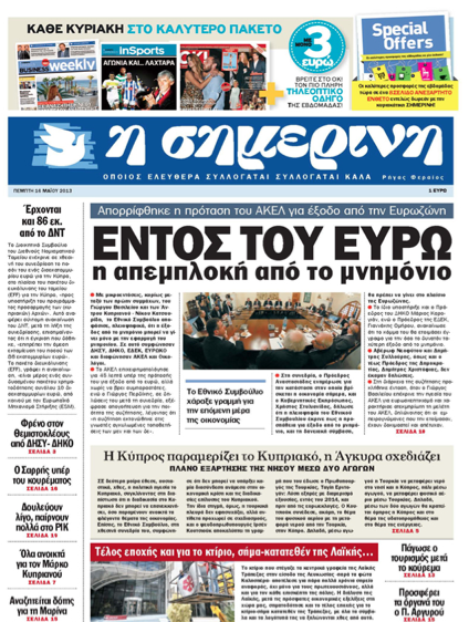 «Η Σημερινή», στο κύριο της θέμα με τίτλο «Εντός του ευρώ», γράφει ότι με μικροεντάσεις, κυρίως μεταξύ των πρώην συμμάχων, του Γ. Βασιλείου και των Α. Κυπριανού και Ν. Κατσουρίδη, το Εθνικό Συμβούλιο αποφάσισε πλειοψηφικά ότι η έξοδος από το μνημόνιο μπορεί να γίνει μόνο με την εφαρμογή του μνημονίου. Αλλού, γράφει ότι σε δεύτερη μοίρα έθεσε το Εθνικό Συμβούλιο το Κυπριακό, συγκλίνοντας στη διαπίστωση ότι η διαδικασία στο Κυπριακό δεν μπορεί να επανεκκινήσει όσο παραμένουν ανοικτά τα θέματα της οικονομίας. Αναφέρεται επίσης στο ότι το ΔΝΤ ενέκρινε χθες τη δόση για την Κύπρο ύψους ενός δις και ότι εκταμιεύονται άμεσα 86 εκατ. ευρώ.