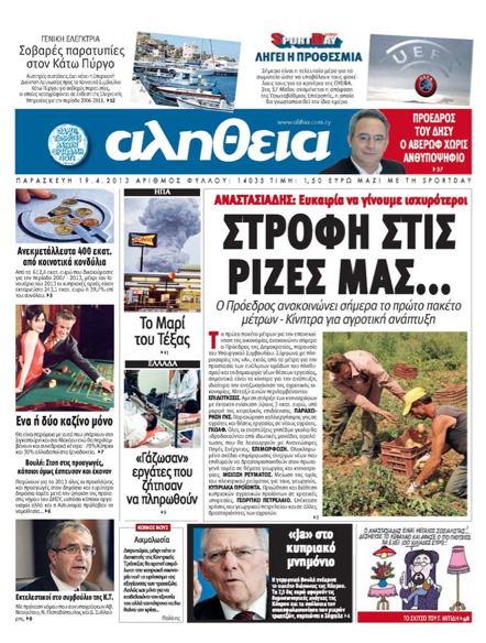 «Στροφή στις ρίζες μας…» είναι ο τίτλος του κυρίου θέματος της «Αλήθειας» που αναφέρεται στην ανακοίνωση απόψε από τον Πρόεδρο Αναστασιάδη των μέτρων για επανεκκίνηση της οικονομίας, μεταξύ αυτών και μέτρα για αγροτική ανάπτυξη. Αλλού η εφημερίδα αναφέρει ότι από τα 612,4 εκ ευρώ που δικαιούται η Κύπρος από τα κοινοτικά κονδύλια για την περίοδο 2007-2013 , οι αρχές εκταμίευσαν μόνο τα 243,1 εκ ή ποσοστό 39,7%. Επίσης η «Α» γράφει ότι γερμανική βουλή είπε «Ja» στο πακέτο διάσωσης της Κύπρου και αναφέρεται στις δηλώσεις Σόϊμπλε ενώπιον της Bundestag.
