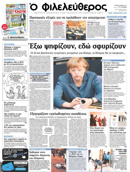 Ο «Φιλελεύθερος» με κύριο τίτλο «Έξω ψηφίζουν, εδώ σφυρίζουν» γράφει ότι οι ξένοι Βουλευτές εγκρίνουν το μνημόνιο ενώ στην Κύπρο υπέρ θα ψηφίσουν όπως όλα δείχνουν, μόνο οι Βουλευτές του ΔΗΣΥ και του ΔΗΚΟ και η Κυβέρνηση προειδοποιεί ήδη για τις συνέπειες. Σε άλλο δημοσίευμά του ο «Φ» αναφέρει ότι δημιουργείται μείζον θέμα αναφορικά με τον τρόπο που ενήργησαν Υπουργοί και ΔΣ ημικρατικών για να προλάβουν την απόφαση της Βουλής χθες για πάγωμα των προαγωγών. Αλλού η εφημερίδα γράφει ότι επενδυτικοί οίκοι από το εξωτερικό άρχισαν να υπόσχονται εξαγορά κουρεμένων λογαριασμών από την Τράπεζα Κύπρου ή και χαμένων καταθέσεων στη Λαϊκή.