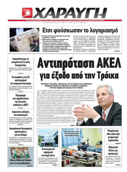 «Αντιπρόταση ΑΚΕΛ για έξοδο από την Τρόικα» τιτλοφορεί το κύριό της θέμα η «Χαραυγή» που αναφέρεται στις δηλώσεις του Αντρου Κυπριανού ότι η παραμονή στο μνημόνιο θα οδηγήσει σε κατηφορική πορεία την ίδια ώρα που η Κυβέρνηση, θέτει εκβιαστικά το δίλημμα, όπως αναφέρει η εφημερίδα, ότι η ψήφιση του μνημονίου είναι μονόδρομος. Αλλού γράφει ότι οι Financial Times αποκαλύπτουν την σκευωρία, όπως αναφέρεται, Κυβέρνησης-Τρόικας και ότι φούσκωναν τις ανάγκες των τραπεζών κατά 6 δις και του κράτους κατά 1,7 δις. Σε άλλο πρωτοσέλιδο δημοσίευμά της η «Χ» αναφέρει ότι σε γνωμάτευσή της η Γενική Εισαγγελία , με ημερομηνία 19/2/2013, για την ανάγκη νομοθετικής επικύρωσης μνημονίου-δανειακής σύμβασης.