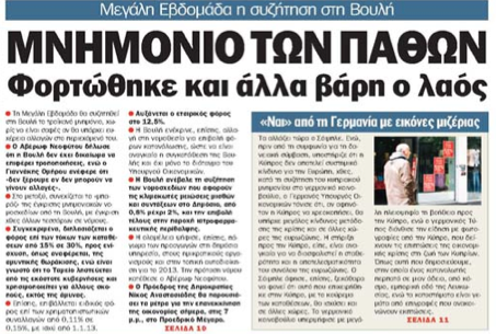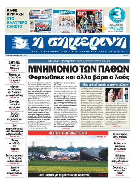 Με τίτλο « Μνημόνιο των παθών, Φορτώθηκε και άλλα βάρη ο λαός» η «Σημερινή» αναφέρεται στα νομοσχέδια που ψήφισε χθες η Βουλή και στις πρόνοιές τους ενώ σημειώνει ότι το μνημόνιο θα συζητηθεί τη Μεγάλη Βδομάδα. Σε άλλο δημοσίευμα η εφημερίδα αναφέρει ότι η Γερμανία είπε ΝΑΙ στο πακέτο για την Κύπρο την ίδια ώρα που τα γερμανικά ΜΜΕ πρόβαλλαν εικόνες με τις επιπτώσεις της κρίσης στους Κύπριους πολίτες. Αλλού η «Σ» αναφέρεται στην δεύτερη τραγωδία στις ΗΠΑ μετά τη Βοστόνη, με την έκρηξη σε εργοστάσιο λιπασμάτων στο Τέξας με 15 νεκρούς.