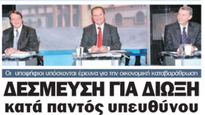 Η τρίτη και τελευταία τηλεοπτική τηλεμαχία ανάμεσα στους τρεις βασικούς υποψηφίους για την Προεδρία της Κυπριακής Δημοκρατίας, οι δεσμεύσεις, οι εντάσεις, οι αντιπαραθέσεις μεταξύ των υποψηφίων, καθώς και οι εκτιμήσεις για το ποιός ήταν ο νικητής του ντιμπέιτ και ποιοί βρέθηκαν σε δύσκολη θέση είναι το κύριο θέμα που προβάλλεται στα περισσότερα πρωτοσέλιδα του κυπριακού Τύπου της Δευτέρας. Παράλληλα προβάλλεται ως κύριο θέμα το χθεσινό Eurogroup κατά το οποίο ασκήθηκαν πιέσεις στη Λευκωσία για να αποδεχθεί έλεγχο για το ξέπλυμα βρώμικου χρήματος από ανεξάρτητη ιδιωτική εταιρεία, ενώ ο Πρόεδρος του Eurogroup δεν απέκλεισε το ενδεχόμενο κουρέματος καταθέσεων και ομολόγων ως μέρος του πακέτου διάσωσης.