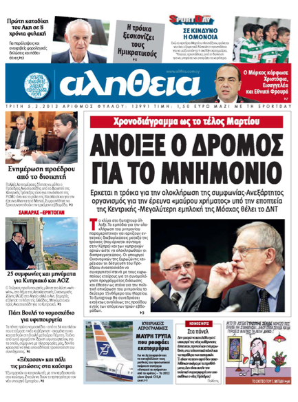 Η «Αλήθεια» στο κύριο της θέμα, με τίτλο «Άνοιξε ο δρόμος για το μνημόνιο», γράφει πως έρχεται η τρόικα για την ολοκλήρωση της συμφωνίας και πως ανεξάρτητος οργανισμός θα εμπλακεί στην έρευνα «μαύρου χρήματος» υπό την εποπτεία της Κεντρικής. Αλλού σημειώνει πως πολλές λεπτομέρειες ζήτησε να μάθει ο Πρόεδρος Αναστασιάδης από το Διοικητής της Κεντρικής Τράπεζας τόσο για την έκθεση της Pimco όσο και για το ρόλο της Black Rock και για την έρευνα Alvarez and Marshal. Σε άλλο θέμα γράφει πως πάει στη Βουλή νομοσχέδιο για το θέμα των Υφυπουργείων.