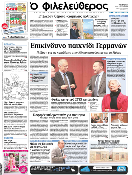 “O Φιλελεύθερος», στο κύριο του θέμα με τίτλο «Επικίνδυνο παιχνίδι Γερμανών», αναφέρει πως ενώπιον σκληρών πιέσεων βρέθηκε χθες ο Υπουργός Οικονομικών Μιχάλης Σαρρής, αφού ο γερμανικός άξονας εξακολουθεί να θέτει θέμα κουρέματος χρέους και ανασφάλιστων καταθέσεων στην Κύπρο, παρά την κάθετα αντίθετη θέση της Λευκωσίας. Αλλού σημειώνει πως θέματα χαμηλής πολιτικής επιλέγουν να συζητούν Αθήνα και Άγκυρα, αφήνοντας για τη συνέχεια τα μεγάλα θέματα. Εξάλλου αναφέρει πως πιέζει ο χρόνος για την προώθηση στη Βουλή νομοσχεδίου για τα τέλη και τα νοσήλια των κρατικών νοσηλευτηρίων.