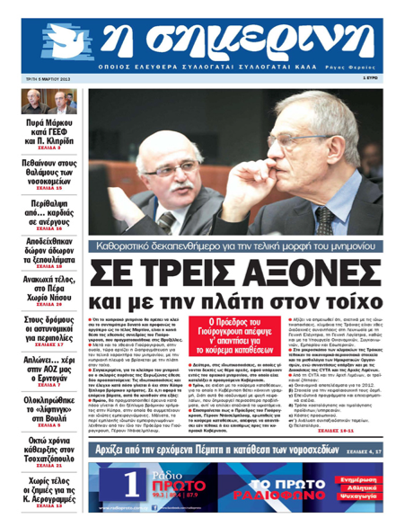 «Η Σημερινή», με κύριο τίτλο «Σε τρεις άξονες και με την πλάτη στον τοίχο», γράφει πως μετά το χθεσινό Γιούρογκρουπ αρχίζει η διαπραγμάτευση για τον τελικό χαρακτήρα του μνημονίου, με την κυπριακή πλευρά να βρίσκεται με την πλάτη στον τοίχο. Αναφέρει επίσης πως κατά την απολογία του στη δίκη για τη φονική έκρηξη στο Μαρί, ο πρώην ΥΠΕΞ Μάρκος Κυπριανού είπε πως εφάρμοζε την πολιτική Χριστόφια και εξαπέλυσε πυρά κατά του ΓΕΕΦ και του Γενικού Εισαγγελέα. Αλλού σημειώνει πως χάνονται ζωές στους θαλάμους νοσοκομείων και πως επείγει η δημιουργία κλινικής αυξημένης φροντίδας στα νοσοκομεία.