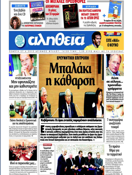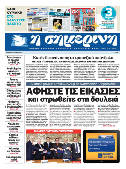 «Η Σημερινή», υπό τον τίτλο «Αφήστε τις εικασίες και στρωθείτε στη δουλειά», γράφει ότι η Κύπρος εισέπραξε χθες άλλο ένα δισεκατομμύριο ευρώ από τους δανειστές της και έτσι συμπληρώνεται η πρώτη δόση του συνολικού ποσού των εννέα δις ευρώ που θα δοθεί εντός της τριετίας. Σε άλλο θέμα γράφει ότι προβληματικό προβλέπεται το μέλλον της Ερευνητικής Επιτροπής για την οικονομία, μετά την απόφαση, κατά πλειοψηφία, των μελών της να μην διερευνούν υποθέσεις που βρίσκονται ενώπιον του Δικαστηρίου, απόφαση, η οποία αφήνει εκτός διερεύνησης, τραπεζικές υποθέσεις μεγάλης σημασίας, όπως εκείνη της Λαϊκής Τράπεζας και της εξαγοράς της Uniastrum από την Τράπεζα Κύπρου. Αλλού γράφει ότι το όνειρο έγινε πραγματικότητα – έπεσαν οι υπογραφές για τον τερματικό σταθμό υγροποίησης φυσικού αερίου.
