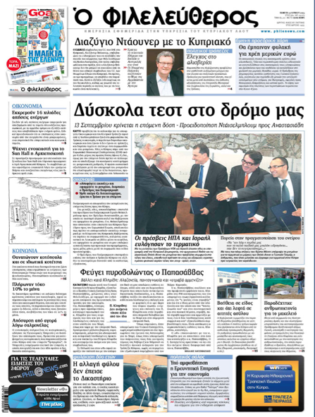 «Ο Φιλελεύθερος», με κύριο τίτλο «Δύσκολα τεστ στο δρόμο μας» γράφει ότι καυτό προβλέπεται το Καλοκαίρι για το Υπουργείο Οικονομικών και την Κεντρική Τράπεζα αφού από 17 Ιουλίου μπαίνουν ξανά στο μικροσκόπιο της τρόικας η οικονομία, η πορεία των δημοσίων οικονομικών και όσα έγιναν ή δεν έγιναν σε τράπεζες και δημόσιο τομέα σε σχέση με όσα συμφωνήθηκαν στο μνημόνιο. Αλλού γράφει ότι ο ειδικός σύμβουλος του ΓΓ του ΟΗΕ στο Κυπριακό Αλεξάντερ Ντάουνερ επιβεβαιώνει το ενδιαφέρον του να αναλάβει την ηγεσία του κόμματος των Φιλελευθέρων της Νοτίου Αυστραλίας, κι αν τούτο επιβεβαιωθεί και στην πράξη τότε δεν θα μπορεί να συνεχίσει από τη θέση του ειδικού συμβούλου του ΓΓ του ΟΗΕ στο Κυπριακό. Σε άλλο θέμα γράφει ότι «φεύγει πυροβολώντας ο Παπασάββας – βάλλει κατά Κληρίδη : Αλαζονεία, παντογνωσία και «στραβά αρμενίζει»`.