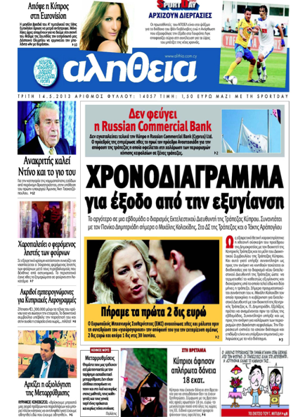 Η εφημερίδα «Αλήθεια» με τίτλο «Χρονοδιάγραμμα για έξοδο από την εξυγίανση» στο κύριό της θέμα γράφει πως το αργότερο σε μια εβδομάδα αναμένεται ο διορισμός Εκτελεστικού Διευθυντή της Τράπεζας Κύπρου ενώ σήμερα συναντάται με τον Διοικητή της ΚΤ ο Μιχάλης Κολακίδης. Αλλού αναφέρει ότι δεν φεύγει από την Κύπρο η Russian Commercial Bank, όπως ενημέρωσε χθες ο Πρόεδρός της τον Πρόεδρο της Δημοκρατίας Νίκο Αναστασιάδη. Σε άλλο θέμα γράφει ότι αρχίζει η αξιολόγηση της εκπαιδευτικής μεταρρύθμισης και ο Υπ. Παιδείας μίλησε για σειρά πράξεων και παραλήψεων που μας οδήγησαν εδώ που έχουμε οδηγηθεί.