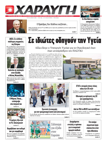 Η εφημερίδα «Χαραυγή» μες τίτλο «Σε ιδιώτες οδηγούν την υγεία» γράφει ότι άλλα έλεγε ο Υπουργός Υγείας για το Ογκολογικό όταν ήταν Αντιπρόεδρος της ΠΑΣΥΚΙ στο θέμα της δημιουργίας κρατικών ακτινοθεραπευτικών τμημάτων σε Λευκωσία και Λεμεσό. Αλλού γράφει ότι στο 27,8% έφθασε η ανεργία στους νέους κάτω των 25 ετών. Σε άλλο θέμα αναφέρει ότι ο Ντίνος Μιχαηλίδης, πρώην Υπουργός και ο γιος του κλήθηκαν σε απολογία για την υπόθεση Τσοχατζόπουλου στην Ελλάδα.