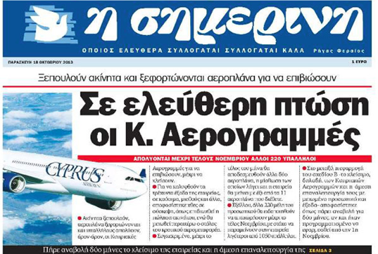 «Η Σημερινή», στο κύριο της θέμα με τίτλο «Σε ελεύθερη πτώση οι Κ. Αερογραμμές», γράφει ότι ακίνητα ξεπουλούν, αεροπλάνα ξεφορτώνονται και υπαλλήλους απολύουν, άρον-άρον, οι Κυπριακές Αερογραμμές για να επιβιώσουν, μέχρι να κλείσουν. Αλλού, γράφει ότι επιτόκια που φθάνουν και ξεπερνούν, ακόμη και το 14%, επιβάλλουν τράπεζες σε δανειολήπτες, προκειμένου να προχωρήσουν σε αναδιαρθρώσεις δανείων ή όταν κάποιο δάνειο καθυστερεί να εξυπηρετηθεί. Γράφει, επίσης, ότι η Βουλή υπερψήφισε χθες την πρόταση νόμου του ΑΚΕΛ για μείωση των οικιστικών όσο και των εμπορικών ενοικίων.