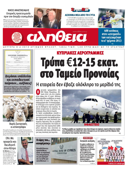 Η «Αλήθεια», με τίτλο «Τρύπα €12-15 εκατ. στο Ταμείο Προνοίας» γράφει ότι οι Κυπριακές Αερογραμμές δεν έβαζαν ολόκληρο το μερίδιο τους στο Ταμείο Προνοίας των υπαλλήλων και επικαλείται δηλώσεις του ΓΓ της ΣΕΚ ότι η τρύπα είναι γύρω στα €12 εκ., ενώ κάποιοι άλλοι αρμόδιοι, όπως γράφει, ανεβάζουν το ποσό αυτό στα €15 εκ. Σε άλλο της πρωτοσέλιδο θέμα η εφημερίδα γράφει ότι καθημερινό φαινόμενο είναι προαγωγές εκπαιδευτικών και άλλων δημοσίων υπαλλήλων. Αλλού αναφέρεται στις προσπάθειες που καταβάλλονται ώστε το ποσοστό της απομείωσης των καταθέσεων να μην ξεπεράσει το 50%.
