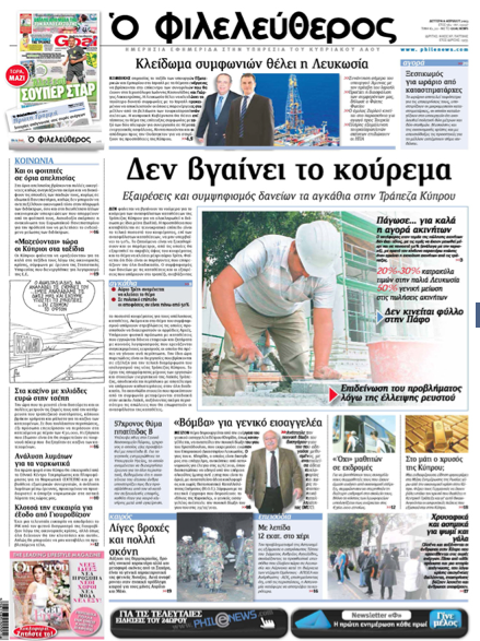 Ο «Φιλελεύθερος», με κύριο πρωτοσέλιδο τίτλο «Δεν βγαίνει το κούρεμα» γράφει ότι εξαιρέσεις και συμψηφισμός δανείων είναι τα αγκάθια στην Τράπεζα Κύπρου, ενώ αύριο Τρίτη αναμένεται να κλείσει το θέμα. Σε άλλο του πρωτοσέλιδο θέμα ο «Φ» κάνει λόγο στο ταξίδι των Υπουργών Εξωτερικών και Εμπορίου στο Ισραήλ, γράφοντας ότι η Λευκωσία θέλει να κλειδώσει το ταχύτερο δυνατό συμφωνίες με το Ισραήλ προκειμένου να αποκλειστούν οι όποιες παρενέργειες στο μέλλον από τη βελτίωση σχέσεων Ισραήλ – Τουρκίας. Αλλού γράφει ότι πάγωσε για καλά η αγορά ακινήτων, αναφέροντας ότι οι τιμές έχουν μειωθεί μέχρι και σε ποσοστό 50%.