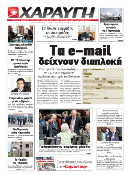 «Τα e-mail δείχνουν διαπλοκή» γράφει στο κύριο της πρωτοσέλιδο θέμα η «Χαραυγή» αναφέροντας ότι σάλο προκάλεσε η υπόθεση διαπλοκής, πιθανής διαφθοράς και διάπραξης ποινικών αδικημάτων που έφερε στο φως η «Χ» και στην οποία φέρεται να εμπλέκεται κρατικός αξιωματούχος, πρώην Υπουργός και δημοσιογράφος σε υπόθεση που πάει πίσω στο 2006. Σε άλλο της θέμα η «Χ» αναφέρει ότι Χάρης Γεωργιάδης και Πανίκος Δημητριάδης έχουν κληθεί να παραστούν ενώπιον της Επιτροπής Οικονομικών της Βουλής για να δώσουν εξηγήσεις όσον αφορά στο Μνημόνιο και την έκθεση Alvarez & Marshall. Αλλού γράφει ότι ο Όλι Ρεν δήλωσε πως η Κομισιόν επεξεργάζεται οδηγία για θεσμοθέτηση του «κουρέματος».