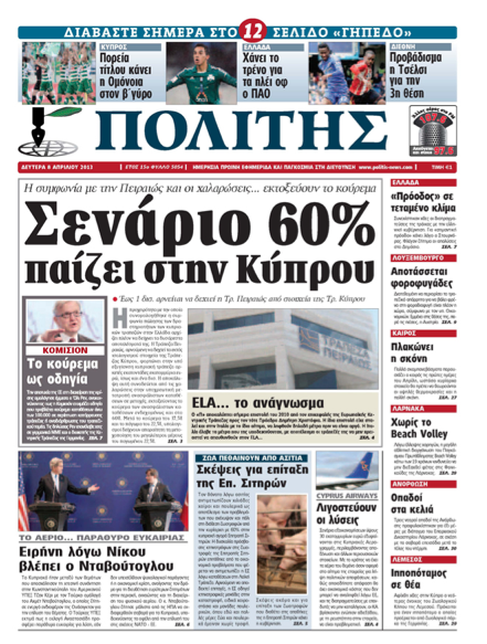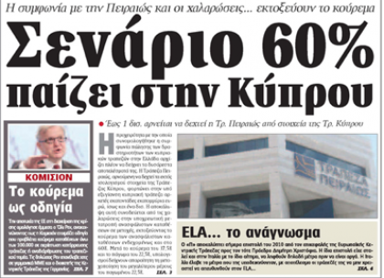 Στο πρωτοσέλιδο του Πολιτη «Σενάριο 60% παίζει στην Κύπρου» και γράφει οτι η συμφωνία με την Πειραιώς και οι χαλαρώσεις εκτοξέυουν το κούρεμα.