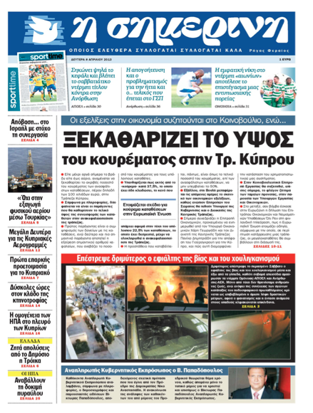 «Ξεκαθαρίζει το ύψος του κουρέματος στην Τρ. Κύπρου» είναι ο κύριος πρωτοσέλιδος τίτλος της εφημερίδα η «Σημερινή», η οποία γράφει ότι ο συμψηφισμός των δανείων με τις καταθέσεις και η εξαίρεση σημαντικού αριθμού κεφαλαίων θα είναι οι παράγοντες που θα καθορίσουν το τελικό ύψος της συνεισφοράς των καταθετών στην ανακεφαλαιοποίηση της Τράπεζας Κύπρου. Σε άλλο της πρωτοσέλιδο θέμα και προβάλλοντας φωτογραφία από τα επεισόδιο γράφει ότι δριμύτερος επέστρεψε το περασμένο Σάββατο ο εφιάλτης της βίας και του χουλιγκανισμού μέσα και έξω από τα γήπεδα. Αλλού επικαλείται πληροφορίες σύμφωνα με τις οποίες δημοσιογράφος Βίκτωρας Παπαδόπουλος αναλαμβάνει καθήκοντα Αναπλ. Κυβερνητικού Εκπροσώπου.