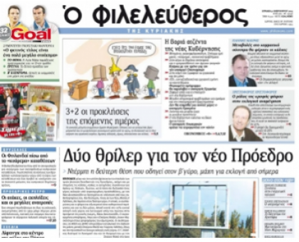 Ο «Φιλελεύθερος» δημοσιεύει πρωτοσέλιδα θέμα που αφορά τις προεδρικές εκλογές. Επίσης, υπό τον τίτλο «Τελευταία ευκαιρία για τις Κυπριακές Αερογραμμές», δημοσιεύει συνέντευξη του Προέδρου του Διοικητικού Συμβουλίου των Κυπριακών Αερογραμμών Σταύρου Σταύρου, ο οποίος ελπίζει ότι η προσπάθεια που καταβάλλεται θα αποφέρει καρπούς. Γράφει, επίσης, ότι ο 18μηνος Σταύρος Στυλλή πέρασε από ιατροδικαστική εξέταση μετά την περιπέτεια εξαφάνισής του, και εντοπίστηκαν κακώσεις γύρω από το λαιμό του που εκτιμάται ότι οφείλονται σε ζώνη ασφαλείας. Επίσης, γράφει ότι η Φινλανδία βρίσκεται πίσω από τη σεναριολογία για «κούρεμα» των ανασφάλιστων κυπριακών καταθέσεων.