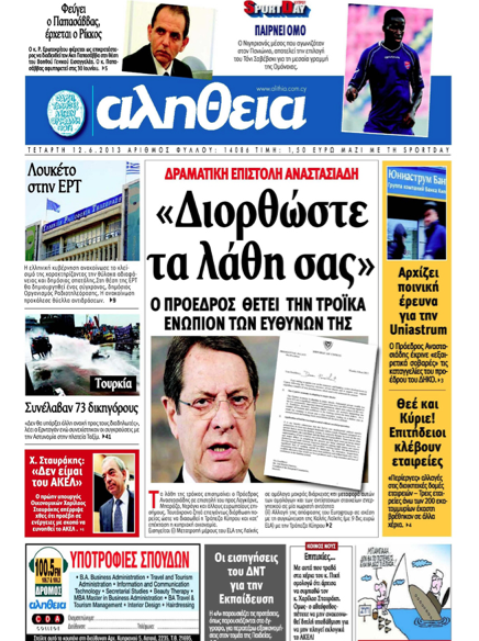 Η «Αλήθεια», κάτω από τον τίτλο «Διορθώστε τα λάθη σας», γράφει στο κύριο της θέμα ότι ο Πρόεδρος Αναστασιάδης σε επιστολή του προς Λαγκάρντ, Μπαρόζο, Ντράγκι επισημαίνει τα λάθη της Τρόικας ζητώντας επειγόντως διόρθωση πορείας ώστε να διασωθεί η Τράπεζα Κύπρου. Αλλού, γράφει ότι αρχίζει ποινική έρευνα για την Uniastrum, καθώς ο Πρόεδρος Αναστασιάδης έκρινε εξαιρετικά σοβαρές τις καταγγελίες του Προέδρου του ΔΗΚΟ. Σε άλλο της θέμα η «Α» γράφει για το κλείσιμο της ΕΡΤ και σημειώνει την ανακοίνωση της ελληνικής Κυβέρνησης, στην οποία η ΕΡΤ χαρακτηρίζεται ως θύλακας αδιαφάνειας και δημόσιας σπατάλης.