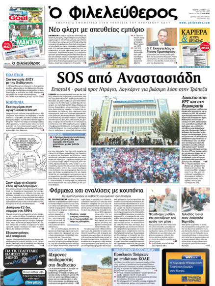 Ο «Φιλελεύθερος», υπό τον τίτλο «SOS από Αναστασιάδη», γράφει για την επιστολή του Προέδρου της Δημοκρατίας προς τους δανειστές της Κύπρου, στην οποία μεταξύ άλλων, επικρίνει τους εκπροσώπους της Τρόικας που επιμένουν στους περιορισμούς αντί στον εντοπισμό μακροπρόθεσμης βιώσιμης και διατηρήσιμης λύσης για τη ρευστότητα της Τράπεζας Κύπρου. Αλλού, γράφει ότι η Κομισιόν σε έκθεσή της για τον «Κανονισμό της Πράσινης Γραμμής» παρουσιάζεται να φλερτάρει εμμέσως με το απευθείας εμπόριο ως αντίδοτο στη μείωση των εμπορικών συναλλαγών μέσω του κατοχικού οδοφράγματος. Σε άλλο του θέμα γράφει ότι οι ασθενείς στα κρατικά νοσηλευτήρια θα πληρώνουν φάρμακα και αναλύσεις με κουπόνια.