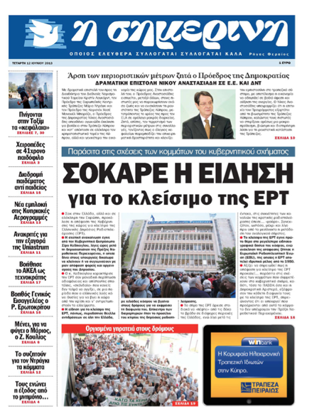 Η «Σημερινή», στο κύριο της θέμα με τίτλο «Σόκαρε η είδηση για το κλείσιμο της ΕΡΤ», γράφει ότι η απόφαση της ελληνικής Κυβέρνησης πυροδότησε θύελλα αντιδράσεων σε όλη την Ελλάδα με χιλιάδες κόσμου να βγαίνει στους δρόμους για να εκφράσει τη διαφωνία του. Στο δεύτερο της θέμα η «Σ» γράφει για την επιστολή Αναστασιάδη προς τους επικεφαλής της Τρόικας, σημειώνοντας πως ο Πρόεδρος εισηγείται στους πιστωτές μας να παραχωρήσουν ανάσα ζωής και να ενισχύσουν τη ρευστότητα της Τράπεζας Κύπρου, μετατρέποντας το χρέος προς τον ELA σε ομόλογα μακράς διάρκειας. Αλλού, γράφει ότι η Αστυνομία συνέλαβε 41χρονο Ελληνοκύπριο με την κατηγορία της παιδικής πορνογραφίας, ο οποίος φαίνεται να παραδέχθηκε στους ανακριτές πως διατηρούσε ψεύτικους λογαριασμούς στο facebook για να συνομιλεί με κορίτσια.
