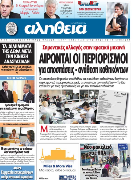 Η «Αλήθεια», στο κύριο της θέμα με τίτλο «Αίρονται οι περιορισμοί για αποσπάσεις-ανάθεση καθηκόντων», γράφει ότι οι αποσπάσεις δημοσίων υπαλλήλων και η ανάθεση καθηκόντων θα γίνονται χωρίς χρονικό περιορισμό και χωρίς τη συναίνεση των υπαλλήλων, ενώ το ίδιο ισχύει και για τους ημικρατικούς και για την τοπική αυτοδιοίκηση. Αλλού, γράφει ότι η Δημόσια Εταιρεία Φυσικού Αερίου, με επιστολή της, ζητά από την Vitol να δηλώσει εάν προτίθεται να βελτιώσει την αρχική της προσφορά για την ενδιάμεση λύση φυσικού αερίου. Επίσης, γράφει για την ερευνητική επιτροπή για την τ/κ περιουσία στη Δρομολαξιά και ότι η ομάδα που συστάθηκε για να εξετάσει την πρώτη πρόταση της εταιρείας του Νίκου Λίλλη για την επένδυση της Cyta δεν συνεδρίασε ποτέ αφού για άγνωστους λόγους δεν τη συγκάλεσε ο Πρόεδρος της Στάθης Κιττής.