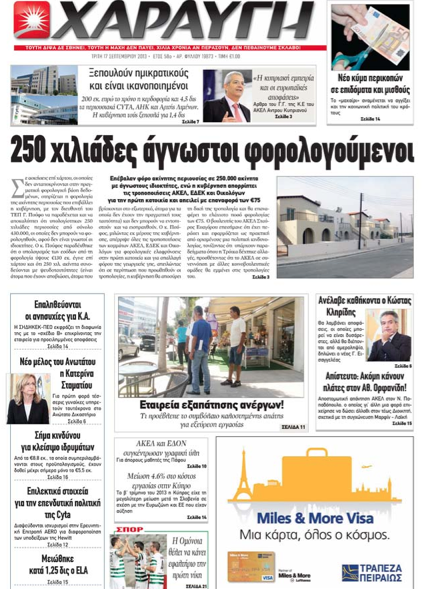 Η «Χαραυγή», στο πρωτοσέλιδό της θέμα με τίτλο «250 χιλιάδες άγνωστοι φορολογούμενοι», γράφει ότι επέβαλαν φόρο ακίνητης περιουσίας σε 250.000 ακίνητα με άγνωστους ιδιοκτήτες, ενώ η Κυβέρνηση απορρίπτει τις τροποποιήσεις ΑΚΕΛ, ΕΔΕΚ και Οικολόγων για την πρώτη κατοικία και απειλεί με επαναφορά των 75 ευρώ. Επίσης, γράφει ότι η Κυβέρνηση ξεπουλά ημικρατικούς οργανισμούς για 1,4 δις ευρώ και είναι και ικανοποιημένη, την ώρα που είναι στα 200 εκατ. ευρώ η κερδοφορία τους και 4,5 δις ευρώ τα περιουσιακά στοιχεία της Cyta, ΑΗΚ και Αρχής Λιμένων. Σε άλλο θέμα γράφει ότι έρχεται νέο κύμα περικοπών σε επιδόματα και μισθούς και ότι το μαχαίρι αναμένεται να αγγίξει και την κοινωνική πολιτική του κράτους.