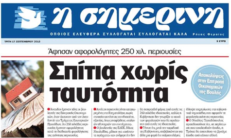 «Η Σημερινή», στο κύριο της θέμα με τίτλο «Σπίτια χωρίς ταυτότητα», αναφέρει ότι άναυδοι έμειναν χθες οι βουλευτές της Επιτροπής Οικονομικών όταν άκουσαν από το Διευθυντή του Τμήματος Εσωτερικών Προσόδων ότι 250 χιλιάδες περιουσίες έμειναν αφορολόγητες κατά τη διαδικασία φορολόγησης ακίνητης περιουσίας που είναι καταχωρημένες μεν στο Κτηματολόγιο αλλά χωρίς στοιχεία ταυτότητας του ιδιοκτήτη. Αλλού, γράφει ότι πανικός επικρατεί για τις δύο ιερόδουλες στη Λάρνακα, αφού βρέθηκαν θετικές σε σεξουαλικώς μεταδιδόμενα αφροδίσια νοσήματα. Επίσης, σε άλλο θέμα γράφει ότι πιθηκάκι στο Μούτταλο δραπέτευσε και δάγκωσε πέντε γυναίκες.