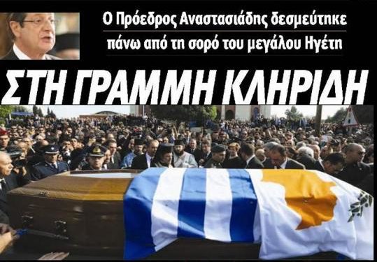 Η χθεσινή κηδεία του πρώην Προέδρου της Δημοκρατίας Γλαύκου Κληρίδη κυριαρχεί στα πρωτοσέλιδα των κυπριακών εφημερίδων σήμερα. Ο επικήδειος λόγος του Προέδρου Αναστασιάδη, η παρουσία της ελληνικής ηγεσίας, Τ/κ πολιτικών, ξένων διπλωματών και χιλιάδων κόσμου στην κηδεία προβάλλονται από τον Τύπο. Άλλα θέματα που προβάλλουν οι εφημερίδες είναι ο διάλογος στον οποίο εισέρχεται ο Υπουργός Οικονομικών με τις συντεχνίες των ημικρατικών οργανισμών, η διαχείριση των μεγάλων και επισφαλών δανείων από την Τράπεζα Κύπρου, η χθεσινή έγκριση από το Ευρωκοινοβούλιο του Πολυετούς Δημοσιονομικού Πλαισίου 2014-2020, και η αναστολή των έργων στην Πλατεία Ελευθερίας μετά από σχετικό διάταγμα που εξασφάλισε ο εργολάβος του έργου Μιλτιάδης Νεοφύτου.