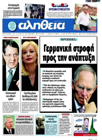 Η «Αλήθεια», υπό τον τίτλο «Γερμανική στροφή προς την ανάπτυξη», γράφει ότι το Βερολίνο τρομάζει από τα ποσοστά της ανεργίας και σχεδιάζει σταδιακή στροφή προς την ανάπτυξη. Γράφει, επίσης, ότι ο Πρόεδρος της Δημοκρατίας Νίκος Αναστασιάδης, μιλώντας σε εκδήλωση στην Έμπα της Πάφου, έστειλε σαφές και ξεκάθαρο μήνυμα προς κάθε κατεύθυνση ότι για την ώρα πρώτιστο θέμα είναι η οικονομία, ενώ εξίσου σημαντικό θέμα είναι η αντιμετώπιση του Κυπριακού. Επίσης, γράφει ότι η Υπουργός Εργασίας και Κοινωνικών Ασφαλίσεων Ζέτα Αιμιλιανίδου έμεινε έκπληκτη όταν είδε το φάκελο με τα αναδρομικά επιδόματα σε αιτητές ασύλου, πολιτικούς πρόσφυγες και άλλους, και ζήτησε αναλυτικά στοιχεία για κάθε περίπτωση.