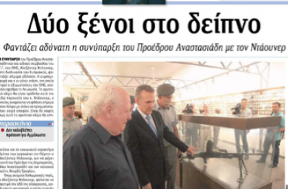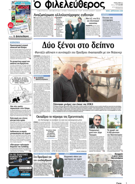 Ο «Φιλελεύθερος», υπό τον τίτλο «Δύο ξένοι στο δείπνο», γράφει ότι η συνύπαρξη του Προέδρου Αναστασιάδη και του Ειδικού Συμβούλου του ΓΓ του ΟΗΕ για το Κυπριακό Αλεξάντερ Ντάουνερ, στη διαδικασία του Κυπριακού, φαντάζει σήμερα αδύνατη, αφού η συμπεριφορά του κ. Ντάουνερ ενοχλεί σφόδρα τη Λευκωσία. Γράφει, επίσης, ότι ο Σύνδεσμος Πολιτικών Κρατουμένων ΕΟΚΑ τέλεσε χθες το ετήσιο μνημόσυνο των πεσόντων και των εν ειρήνη τελειωθέντων αγωνιστών, και το μνημόσυνο του Κωνσταντίνου Παλαιολόγου, στα Κρατητήρια Κοκκινοτριμιθιάς. Επίσης, γράφει ότι στοιχεία από τις εμπορικές τράπεζες και την Κεντρική Τράπεζα ζήτησε η Ερευνητική Επιτροπή που αναζητεί ευθύνες για την κατάσταση στην οικονομία, προσθέτοντας ότι το πόρισμά της αναμένεται τον Οκτώβριο.