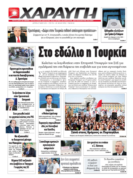 Η «Χαραυγή», υπό τον τίτλο «Στο εδώλιο η Τουρκία», γράφει ότι στο «σκαμνί» θα βρεθεί για άλλη μια φορά η Τουρκία για μη συμμόρφωσή της με αποφάσεις του ΕΔΑΔ, που σχετίζονται με εγκλήματα της Άγκυρας στη διάρκεια της εισβολής και για τους αγνοούμενους. Γράφει, επίσης, ότι ο τέως Πρόεδρος της Δημοκρατίας Δημήτρης Χριστόφιας δήλωσε ότι πιθανή απόσυρση των προτάσεων της ελληνοκυπριακής πλευράς για το Κυπριακό θα αποτελούσε δώρο προς την Τουρκία. Επίσης, γράφει ότι ο Στέφανος Στεφάνου, μέλος του Πολιτικού Γραφείου του ΑΚΕΛ, καταγγέλλει καθημερινή επιστράτευση ψεμάτων και διαστρεβλώσεων για να φορτωθεί η οικονομική κρίση στους ώμους του ΑΚΕΛ, και επισημαίνει την ανάγκη ενίσχυσης της δράσης ενάντια στις προσπάθειες αυτές.