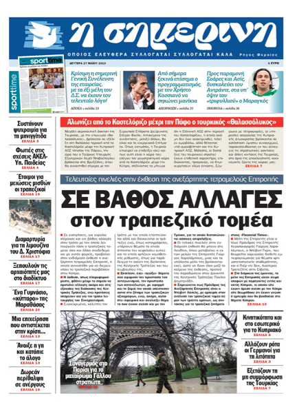 Η «Σημερινή», υπό τον τίτλο «Σε βάθος αλλαγές στον τραπεζικό τομέα», γράφει ότι σε εισηγήσεις για ευρείας κλίμακας και εις βάθος αλλαγές στον τρόπο με τον οποίο λειτουργούν τόσο ο τραπεζικός τομέας όσο και άλλοι συνδεδεμένοι με αυτόν φορείς, προβαίνει στην ενδιάμεση έκθεση η ανεξάρτητη Επιτροπή που συστάθηκε για να διερευνήσει το τραπεζικό περιβάλλον στην Κύπρο. Γράφει, επίσης, ότι μεγάλη αεροναυτική άσκηση της Τουρκίας, με την επωνυμία «Θαλασσόλυκος», βρίσκεται σε εξέλιξη στη θαλάσσια περιοχή απ το Καστελόριζο μέχρι την κυπριακή αποκλειστική οικονομική ζώνη πλησίον της Πάφου. Επίσης, γράφει ότι συναγερμός σήμανε στο Παρίσι για το μαχαίρωμα Γάλλου στρατιώτη.