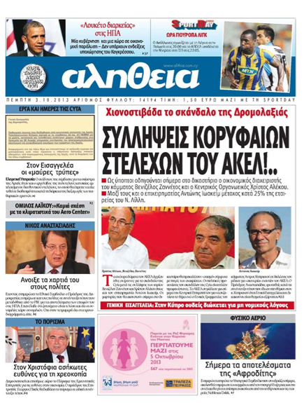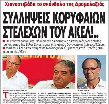 «Συλλήψεις κορυφαίων στελεχών του ΑΚΕΛ!… Χιονοστιβάδα το σκάνδαλο» αναφέρει η «ΑΛΗΘΕΙΑ»,