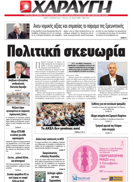 Η «ΧΑΡΑΥΓΗ», από την πλευρά της, μιλά για «Πολιτική σκευωρία. Ο Γενικός Γραμματέας του ΑΚΕΛ καταδικάζει τις συλλήψεις στελεχών του κόμματος καταγγέλλοντας ότι απώτερος στόχος τους είναι να κτυπηθεί το κόμμα και να απαξιωθεί στα μάτια του κόσμου».