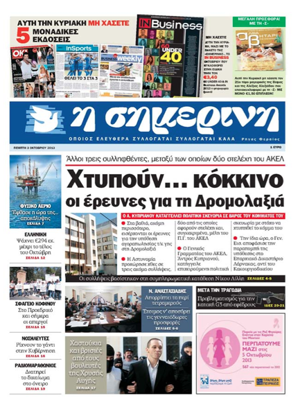 «Χτυπούν… κόκκινο οι έρευνες. ‘Αλλοι τρεις συλληφθέντες, μεταξύ των οποίων και δύο στελέχη του ΑΚΕΛ» σημειώνει «Η ΣΗΜΕΡΙΝΗ»