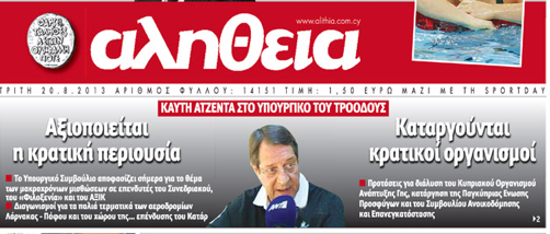 Η «Αλήθεια», υπό τον τίτλο «Επιταγή και μετρητά για δύο αστυνομικούς», γράφει στο κύριο της θέμα ότι από 10 χιλιάδες ευρώ φέρονται να έλαβαν δύο αστυνομικοί ως αντάλλαγμα για ψευδή στοιχεία που κατέγραψαν σε έκθεσή τους για τη διαμονή του Τουρκοκύπριου ιδιοκτήτη του τεμαχίου της Δρομολαξιάς. Αλλού, γράφει ότι το Υπουργικό Συμβούλιο αποφασίζει σήμερα για το θέμα των μακροχρόνιων μισθώσεων σε επενδυτές του Συνεδριακού, του «Φιλοξενία» και ΑΞΙΚ, ενώ θα συζητηθούν και προτάσεις για διάλυση του Κυπριακού Οργανισμού Ανάπτυξης Γης και κατάργηση της Παγκύπριας Ένωσης Προσφύγων και του Συμβουλίου Ανοικοδόμησης και Επανεγκατάστασης. Σε άλλο της θέμα, γράφει ότι οι μέτοχοι της Τράπεζας Κύπρου βρίσκονται στο σκοτάδι καθώς κανείς δεν έχει δει τον ισολογισμό της τράπεζας ούτε την αποτίμηση βάσει της οποίας 18% των μετοχών ανήκει στην «κακή Λαϊκή».