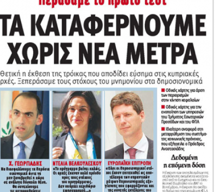 Η “Αλήθεια”, στο κύριο της θέμα με τίτλο «Τα καταφέρνουμε χωρίς νέα μέτρα», γράφει πως θετική είναι η έκθεση της Τρόικας που αποδίδει εύσημα στις κυπριακές Αρχές και πως ξεπεράσαμε τους στόχους του μνημονίου στα δημοσιονομικά. Αλλού αναφέρει πως παρέδωσε την παραίτησή του στον Πρόεδρο ο Σόλων Κασίνης, προαναγγέλλοντας και άλλες παραιτήσεις από το Συμβούλιο της ΚΡΕΤΥΚ. Εξάλλου σημειώνει πως ο Υπουργός Οικονομικών διαβεβαίωσε πως ο Συνεργατισμός θα στηριχτεί και θα ανακεφαλαιοποιηθεί χωρίς να τίθεται θέμα κουρέματος καταθέσεων αλλά με δημόσιο χρήμα.