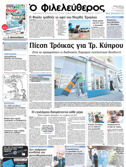 Ο «Φιλελεύθερος», υπό τον τίτλο «Πίεση Τρόικας για Τράπεζα Κύπρου», γράφει ότι το κλιμάκιο της Τρόικας που βρίσκεται στην Κύπρο ζήτησε τον άμεσο διορισμό Εκτελεστικού Διευθυντή για να μπει η Τράπεζα σε πορεία εξόδου από το καθεστώς της διαχείρισης και να προχωρήσει το σχέδιο αναδιάρθρωσης. Αλλού, γράφει ότι 33 εγκλήματα διαπράττονται κάθε μέρα στην Κύπρο, ενώ σύμφωνα με τα στατιστικά στοιχεία υπάρχει μείωση των σοβαρών αδικημάτων κατά το πρώτο τετράμηνο του 2013. Σε άλλο θέμα, ο «Φ» γράφει ότι ο Επίτροπος για τη Διεύρυνση Στέφαν Φούλε απέστειλε αυστηρή επιστολή στον Τ/κ ηγέτη Ντερβίς Ερογλου, κατηγορώντας τον για περιβαλλοντικά εγκλήματα.