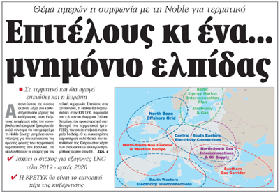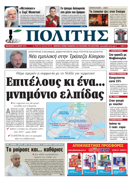 Στη σημερινή εφημερίδα Πολίτης «Επιτέλους κι ενα μνημόνιο ελπίδας» και τονίζει οτι ειναι Θέμα ημερών η συμφωνία με την Noble για τον τερματικό. Η εφημερίδα γράφει οτι απαντώντας σε όσους έκαναν λόγο για καθυστέρηση απο μέρους της κυβέρνησης ο υπουργός ενέργειας ενημέρωσε την κοινοβουλευτική επιτροπή οτι πολύ σύντομα θα υπογραφεί με την Noble Energy μνημόνιο για την κατασκευή της πρώτης φάσης τερματικού υγροποίησης στο Βασιλικό.