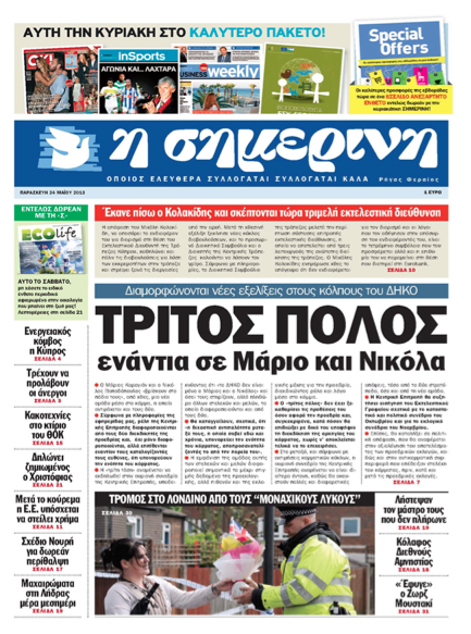 Η «Σημερινή», κάτω από τον τίτλο «Τρίτος Πόλος ενάντια σε Μάριο και Νικόλα», γράφει στο κύριο της θέμα ότι, σύμφωνα με τις πληροφορίες που κατέχει, μέλη της ΚΕ του ΔΗΚΟ διαφοροποιούνται από τους δύο διεκδικητές της Προεδρίας και επιτίθενται εναντίον τους, καταλογίζοντας τους ευθύνες ότι υπονομεύουν την ενότητα του κόμματος. Σε άλλο της θέμα γράφει ότι έκανε πίσω ο Μιχάλης Κολακίδης για τη θέση του Εκτελεστικού Διευθυντή της Τράπεζας Κύπρου και το Συμβούλιο της Τράπεζας μελετά τη σύσταση τριμελούς Εκτελεστικής Διεύθυνσης. Αλλού, γράφει ότι άνοιξαν μέχρι σήμερα 1300 νέες θέσεις εργασίας και πως τα τρία σχέδια απασχόλησης του Υπουργείου Εργασίας προκάλεσαν μεγάλο ενδιαφέρον.