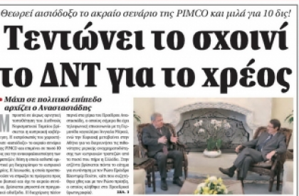 «ΧΩΡΙΣ (Ν)ΤΕΛΕΙΑ οι απαιτήσεις του ΔΝΤ» είναι ο κύριος τίτλος του πρωτοσέλιδου της «Σημερινής» που γράφει ότι η Τρόικα ανεβάζει συνεχώς τον πήχη των απαιτήσεων και ότι δεν αποδέχεται πλέον ούτε το ακραίο σενάριο για τις τράπεζες. Επίσης η «Σ» αναφέρεται στην κατάθεση της υποψηφιότητας Ν. Παπαδόπουλου για την προεδρία του ΔΗΚΟ και στις τοποθετήσεις της ηγεσίας περί προσωπικών φιλοδοξιών του Βουλευτή. Αλλού η εφημερίδα γράφει για κρίσιμες ώρες στις Κυπριακές Αερογραμμές και για την σύσκεψη χθες στο Προεδρικό παρουσία τριών Υπουργών.