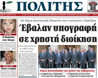 «Ο Φιλελεύθερος» στο κύριο θέμα του, με τίτλο «Χάρτα κατά της διαπλοκής», αναφέρει ότι οι νέοι Υπουργοί δεσμεύτηκαν στον Πρόεδρο δια υπογραφής με Χάρτα Δεοντολογίας, με την οποία διασφαλίζεται συνεχής έλεγχος, που θα λειτουργεί αποτρεπτικά κατά της διαπλοκής και του ρουσφετιού. Εξάλλου, η εφημερίδα γράφει για αναστάτωση στους Ημικρατικούς Οργανισμούς, μετά από πρόσκληση σε συναντήσεις με το κλιμάκιο της Τρόικας την ερχόμενη Δευτέρα και Τρίτη, που έλαβαν από το Υπουργείο Οικονομικών το απόγευμα της Πέμπτης. Σε άλλο θέμα, ο «Φ» γράφει ότι αποζημίωση ύψους 6,6 εκ. ευρώ για τουρκοκυπριακή γη στη Λεμεσό έκανε φτερά και στους δικαιούχους δόθηκαν μόνο 2,7 εκ. με την Αστυνομία να προχωρά σε συλλήψεις.