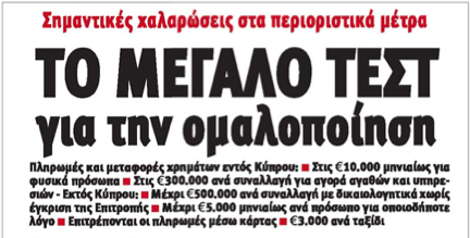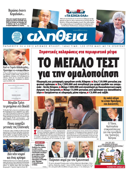 Με τίτλο «Το μεγάλο τεστ για την ομαλοποίηση» η «Αλήθεια» γράφει ότι φέρνουν σημαντικές χαλαρώσεις στους περιορισμούς της διακίνησης κεφαλαίων τα διατάγματα που εξέδωσε το βράδυ της Πέμπτης το Υπουργείο Οικονομικών, αποτελώντας ουσιαστικά το μεγάλο τεστ για την ομαλοποίηση της κατάστασης στις συναλλαγές. Σε άλλο θέμα, γράφει ότι το Ταμείο Αλληλεγγύης του Δημήτρη Χριστόφια μοίρασε μεγάλα ποσά παραμονές των προεδρικών εκλογών σε δυσπραγούντες, σωματεία και οργανισμούς. Ακόμη αναφέρει ότι ο Τάκης Αράπογλου είναι επικρατέστερος για την προεδρία της Τράπεζας Κύπρου.