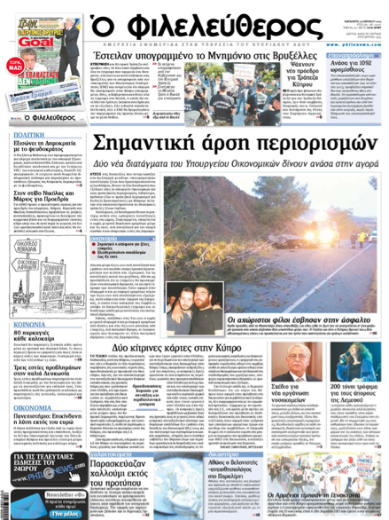 Ο «Φιλελεύθερος», υπό τον τίτλο «Σημαντική άρση περιορισμών» γράφει ότι λύσεις στις δυσκολίες που αντιμετώπιζαν στη διεξαγωγή μεγάλων επιχειρηματικών συναλλαγών ξένοι που δραστηριοποιούνται μέσω Κύπρου, δίνουν τα δύο διατάγματα του Υπουργείου Οικονομικών, ενώ επιτρέπεται η χωρίς μετρητά διακίνηση χρημάτων μέχρι 1 εκ. ευρώ ανά συναλλαγή για αγορά εντός της Δημοκρατίας. Ακόμη, γράφει ότι Κυβέρνηση και Κεντρική Τράπεζα έστειλαν υπογεγραμμένο το μνημόνιο στις Βρυξέλλες, ενώ η Βουλή συνέρχεται εκτάκτως την Τρίτη για να το εξετάσει. Σε άλλο θέμα, γράφει ότι ο Ντάουνερ εξισώνει τη Δημοκρατία με το ψευδοκράτος.