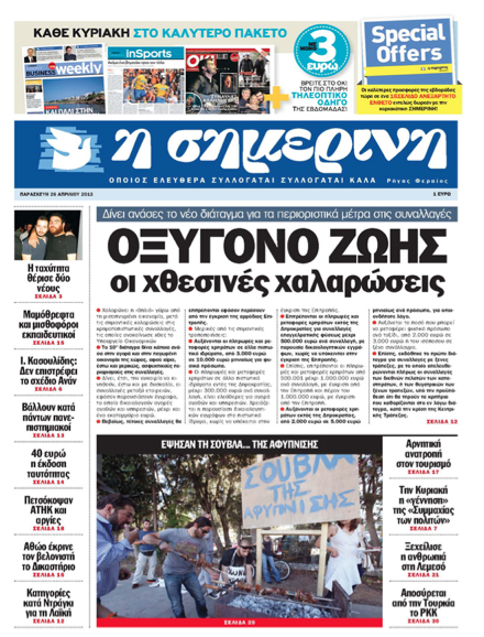 Η «Σημερινή», υπό τον τίτλο «Οξυγόνο ζωής οι χθεσινές χαλαρώσεις» γράφει στο κύριο θέμα της ότι χαλαρώνει η «θηλιά» γύρω από τη μισοπνιγμένη οικονομία μετά τις σημαντικές χαλαρώσεις στις χρηματοπιστωτικές συναλλαγές που περιέχονται στο 10ο διάταγμα. Σε άλλο θέμα γράφει ότι σε ομιλία του στη Βουλή των Κοινοτήτων, στο Λονδίνο, ο Υπουργός Εξωτερικών Ιωάννης Κασουλίδης ανέφερε ότι δεν θα επανέλθει το Σχέδιο Ανάν. Επίσης, η εφημερίδα αναφέρεται στις επικρίσεις των Γερμανών Φιλελευθέρων κατά του Διοικητή της ΕΚΤ Μάριο Ντράγκι σε σχέση με τον ELA της Λαϊκής Τράπεζας.