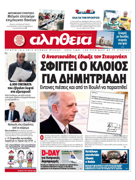 Η «Αλήθεια», υπό τον τίτλο «Σφίγγει ο κλοιός για Δημητριάδη» γράφει για την ανάκληση του Σπύρου Σταυρινάκη από τη θέση του Υποδιοικητή της Κεντρικής Τράπεζας εκ μέρους του Προέδρου της Δημοκρατίας Νίκου Αναστασιάδη, προσθέτοντας ότι η ενέργειά του αποτελεί μήνυμα και προς το Διοικητή της Κεντρικής ότι είναι ανεπιθύμητος. Σε άλλο της θέμα η εφημερίδα γράφει για τη λίστα 6.000 ατόμων που έστειλαν χρήματα στο εξωτερικών, προσθέτοντας ότι η Επιτροπή Θεσμών είναι έξαλλη με τον Διοικητή γιατί άλλα ζητήθηκαν και άλλα έστειλε η Κεντρική. Αλλού αναφέρεται σε δηλώσεις του Υπουργού Οικονομικών για τις εξαιρέσεις από το κούρεμα ότι η Κυβέρνηση δεν θα κάνει κοινωνική πολιτική με χρήματα των καταθετών, καθώς και ότι θα επανεξεταστούν όχι μόνο η εξαίρεση των ασφαλιστικών εταιρειών, αλλά και των πιστωτικών ιδρυμάτων.