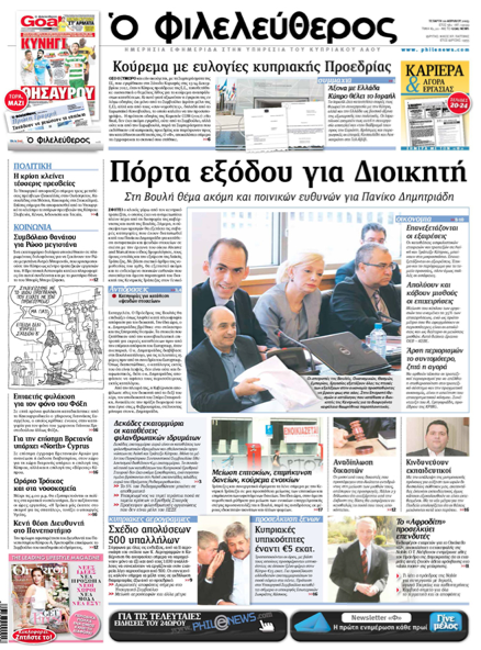 «Ο Φιλελεύθερος», υπό τον κύριο τίτλο «Πόρτα εξόδου για Διοικητή» γράφει ότι σήμερα η σύσκεψη των αρχηγών στη Βουλή θα εξετάσει τις σοβαρές κατηγορίες που έχουν διατυπωθεί κατά του Πανίκου Δημητριάδη για κατάθεση αντιφατικών και ψευδών στοιχείων σε σχέση με την έρευνα του οίκου Alvarez & Marshal. Αλλού γράφει ότι με τα Συμπεράσματα της ΕΕ που εγκρίθηκαν στη Σύνοδο Κορυφής στις 13 – 14 Δεκεμβρίου όταν η Κύπρος προήδρευε της ΕΕ, τοποθετήθηκε ο θεμέλιος λίθος για το κούρεμα ανασφάλιστων καταθέσεων, μέσω αξίωσης έγκρισης πρότασης οδηγίας της Κομισιόν, η οποία δεν έχει ακόμη εγκριθεί. Σε άλλο της πρωτοσέλιδο θέμα γράφει ότι σύμφωνα με όλες τις ενδείξεις η Κυβέρνηση αποφασίζει σήμερα να παραμείνουν μόνο 6 από τα 11 αεροσκάφη του στόλου των Κυπριακών Αερογραμμών και από τους 1030 υπαλλήλους να συνεχίσουν να εργάζονται στην εταιρεία λίγο περισσότεροι από 500.