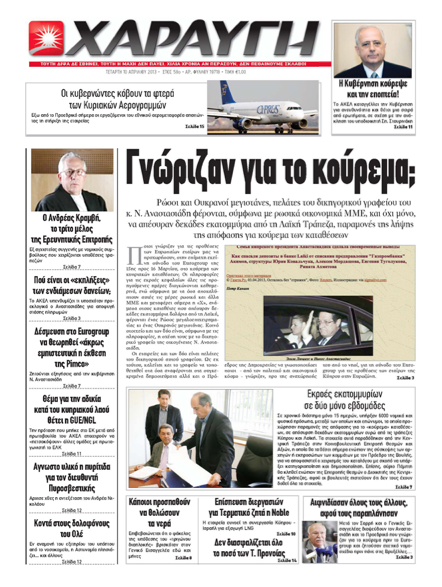 Η «Χαραυγή» στο κύριο της θέμα με τίτλο «Γνώριζαν για το κούρεμα;» γράφει ότι Ρώσοι και Ουκρανοί μεγιστάνες, πελάτες του δικηγορικού γραφείου του Νίκου Αναστασιάδη φέρονται σύμφωνα με ρωσικά οικονομικά ΜΜΕ να απέσυραν δεκάδες εκατομμύρια από τη Λαϊκή παραμονές της λήψης της απόφασης για κούρεμα καταθέσεων. Σε άλλο της πρωτοσέλιδο θέμα γράφει ότι οι κυβερνώντες κόβουν τα φτερά των Κυπριακών Αερογραμμών και ότι οι εργαζόμενοι των Κυπριακών Αερογραμμών θα βρεθούν σήμερα έξω από το Προεδρικό απαιτώντας τη στήριξη της εταιρείας. Αλλού γράφει ότι το ΑΚΕΛ καταγγέλλει την Κυβέρνηση για ανευθυνότητα και θέτει σειρά ερωτημάτων σε σχέση με την ανάκληση του Υποδιοικητή της Κεντρικής Σπύρου Σταυρινάκη.