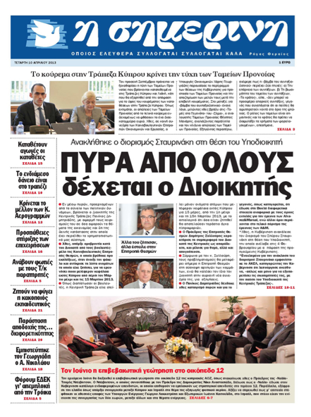«Η Σημερινή», στο κύριο της θέμα υπό τον τίτλο «Πυρά από όλους δέχεται ο Διοικητής» αναφέρεται επίσης στην ανάκληση εκ μέρους του Προέδρου του διορισμού Σταυρινάκη στη θέση του Υποδιοικητή, κάνοντας λόγο για ομοβροντία κατά του Διοικητή χθες από τους Βουλευτές για τη λίστα ονομάτων που μετέφεραν κεφάλαια εκτός Κύπρου. Αλλού γράφει ότι τον ερχόμενο Ιούνιο θα διεξαχθεί η επιβεβαιωτική γεώτρηση στο τεμάχιο 12 της κυπριακής ΑΟΖ, επικαλούμενη δηλώσεις του Προέδρου της Noble ότι έδωσε στην Κυβέρνηση κατάλογο ενδιαφερόμενων επενδυτών για το τεμάχιο. Αλλού γράφει ότι τον προσεχή Σεπτέμβριο θα ξεκαθαρίσει η τύχη των Ταμείων Προνοίας που βρίσκονται κατατεθειμένα στις Τράπεζες Κύπρου και Λαϊκή, κάτι που θα εξαρτηθεί από την απόφαση για το ύψος του κουρέματος των καταθέσεων στην Τράπεζα Κύπρου.